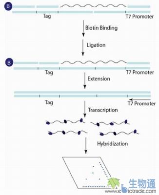 由于miRNA分子太小,这个DNA/RNA杂合体可能不太稳定,因此引入了叠加序列。通过引物及互补序列的延伸,杂合体分子的稳定性增加。含有生物素(biotin,B)的短序列互补结合到其中的一条引物上。通过结合有亲和素(Streptavidin)的磁珠分离出杂合体。然后,两引物在T4连接酶的作用下,被连接成一条DNA片断。随后经过线性扩增(转录),含有生物素的UTP整合到RNA序列中。把转录好的RNA序列和预先准备好的含有不同miRNA序列的膜,进行杂交。最后加入辣根过氧化物酶(HRP)标记的亲和素进行反应,加入发光底物测定。