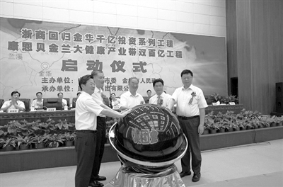 2012年8月3日浙江省金华市委市政府主办的“康恩贝金兰大健康产业带双百亿工程启动仪式”是金华市推进“浙商回归金华千亿投资系列工程”的开场锣,也是康恩贝打造浙江生物医药和大健康产业龙头企业新征途的序幕。全国人大常委会副委员长桑国卫莅临启动仪式并宣布仪式正式启动。