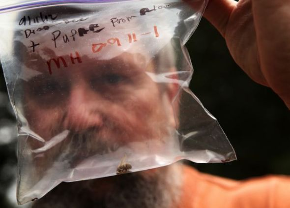 华盛顿养蜂新手马克-霍恩手里拿着一个塑料袋,袋子里有一只死“僵尸蜜蜂”和两个寄生蝇的蛹,它们分别位于袋子的两角