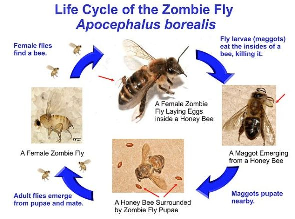 感染“僵尸蜜蜂”的寄生蝇的生命循环类似于影片《异形》里的情节。成年雌性寄生蝇落到蜜蜂的背上,把卵产在蜜蜂的肚子里。卵在蜜蜂体内变成蛆。哈菲尼克说:“蛆会吃光蜜蜂的内脏。”之后它们变成蛹,形成一个很硬的外壳,它看起来有点像饱满米粒的棕色外壳。霍恩在塑料袋里发现的就是这种东西。3到4周后,这些蛹转化成飞虫。华盛顿州立大学昆虫学系主任史蒂夫-谢泼德称,尽管迄今为止并没有证据可以证明寄生蝇是导致蜜蜂减少的主要原因,但是这种害虫似乎正在攻击新寄主。