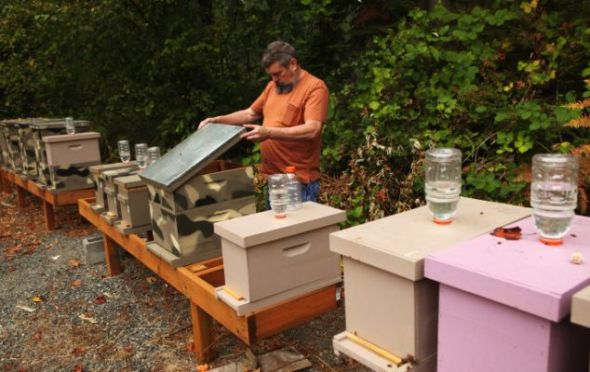 养蜂新手马克-霍恩正在华盛顿肯特市后院里检查一个蜂箱里的蜜蜂。他是第一个发现该州出现“僵尸蜜蜂”的人
