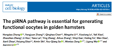2021年9月6日,江苏省医药动物实验基地/南京医科大学医药实验动物中心李建民教授(生殖医学国家重点实验室PI)等在Nature Cell Biology(2021年IF28.824/JCR分区Q1)以长文形式在线发表了The piRNA pathway is essential for generating functional oocytes in golden hamsters。该研究通过敲除PIWIL1、MOV10L1 基因,揭示了piRNA 生成途径在金黄地鼠(golden hamster)雄性和雌性生殖中均具有不可或缺的功能,颠覆了分子生物学、遗传学有关piRNA-PIWI通路在哺乳动物雌性生殖中不具有功能的研究结论。
